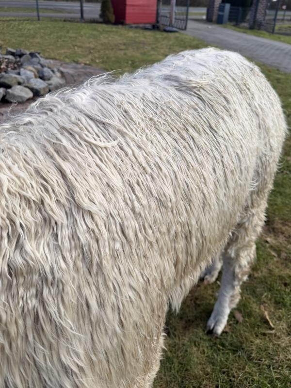 Sein Vlies besticht durch einen wunderschönen Glanz, sehr gute Feinheit, hohe Gleichmäßigkeit sowie ein überzeugendes Faserwachstum – beste Voraussetzungen für Zucht und Ausstellung.